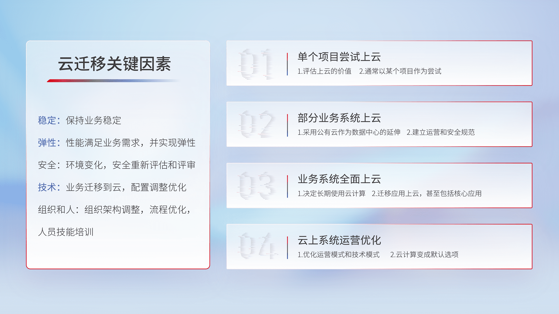 结合实际业务,,,从规划设计、、、、云平台选型、、云原生改造、、数据迁移、、、集成交付,,,,迁移全过程为客户识别最佳上云路径,,,,做好风险识别管理,,,设计网络架构、、、身份权限、、、安全审计合规、、、、操作审计、、、日志审计、、、、监控告警策略、、多站点容灾设计等,,对云上基础设施进行整体规划,,,提升IT治理水平,,,,以满足弹性、、、、高可用、、、、高性能的需求。。。