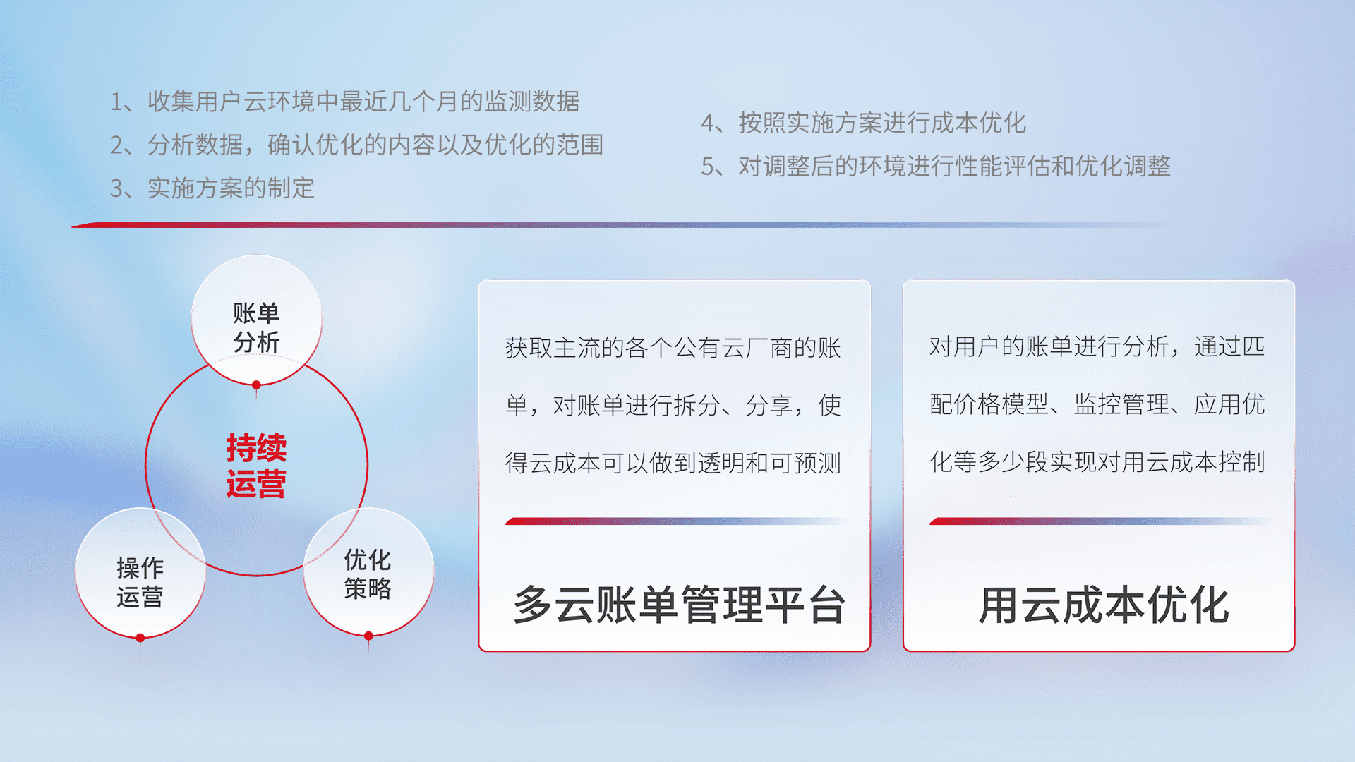 通过多云纳管,,,以统一的资源数据模型把客户的云资源进行抽象和封装,,,,进而实现对多云资源的统一操作,,,保障云资源管理的可靠性、、、稳定性与可用性。。。量身定制化运维内容,,配置、、开发运维、、、、补丁管理、、、备份、、监控、、、、认证和访问管理、、、、审计和日常巡检等,,保障在用云过程中的可靠度,,,,稳定度以及高可用率。。。。